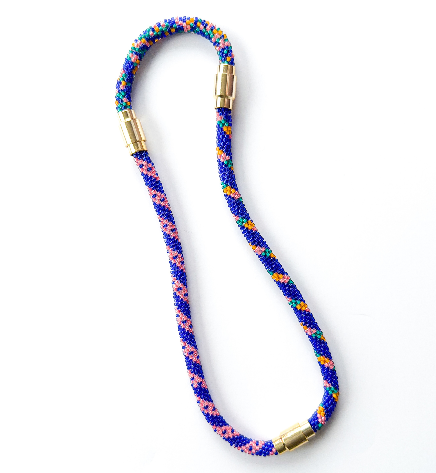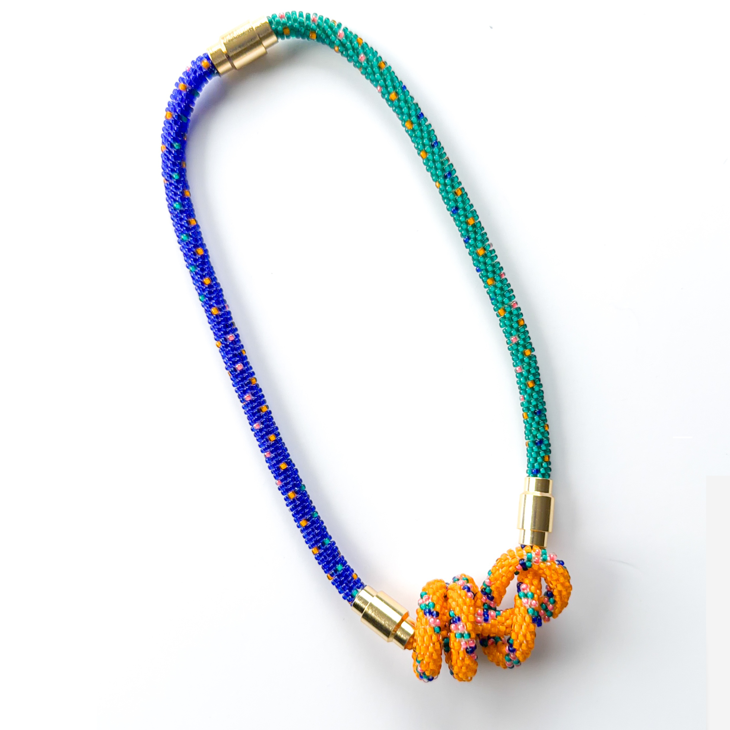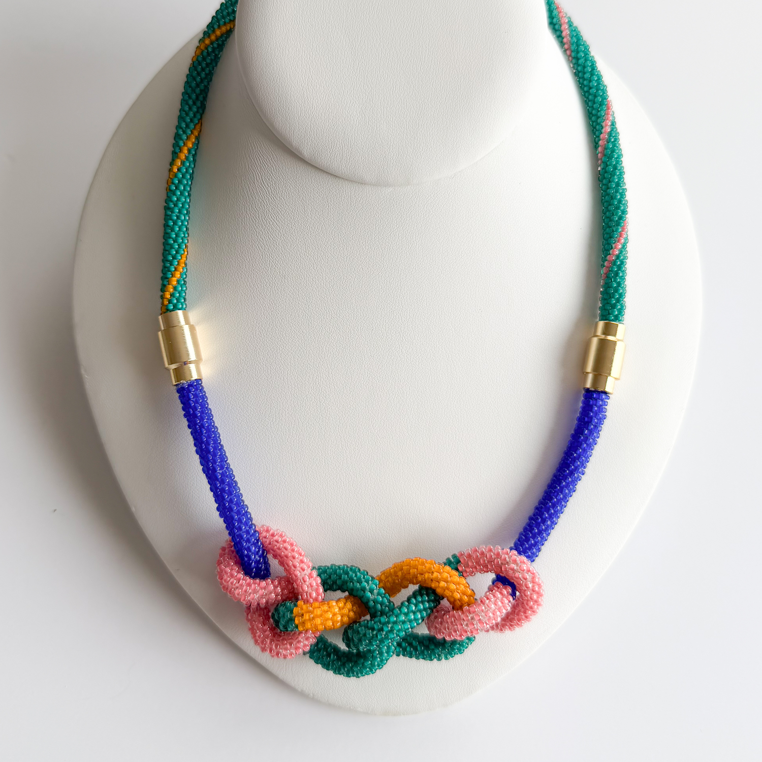 A barrel knot forms an sculptural necklace pendant framed by two Classics.